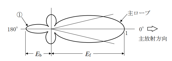 次の記述は、図に示す単一指向性アンテナの電界パターン例について述べたものである。このうち誤っているものを下の番号から選べ。
