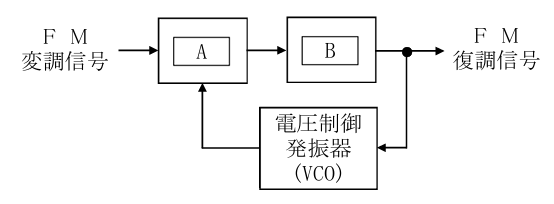 図は、位相同期ループ(PLL)を用いた周波数変調(FM)波の復調器の原理的構成例である。( )内に入れるべき名称の正しい組合せを下の番号から選べ。