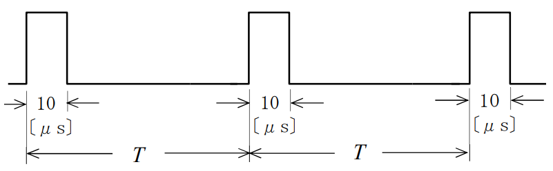 図に示すようにパルスの幅が10[μs]のとき、パルスの繰返し周期T及び衝撃係数(デューティファクタ)Dの値の組合せとして、正しいものを下の番号から選べ。ただし、パルスの繰返し周波数は20[kHz]とする。