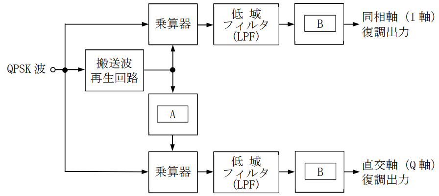次の図は、同期検波によるQPSK復調器の原理的な構成例を示したものである。(  )内に入れるべき字句の正しい組合せを下の番号から選べ。なお、同じ記号の(  )内には、同じ字句が入るものとする。